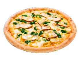 Unsere Chickenpizza mit kleinen panierten Hünchenscheiben und Spinat